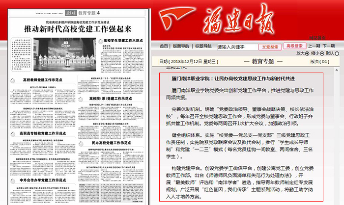 南洋社讯 今日(12月12日)出版的《福建日报》第4版“教育专题”以“厦门南洋职业学院:让民办高校党建思政工作与新时代共进”为题,报道了厦门南洋学院党建思政工作的特色做法。