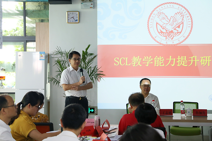 南洋社讯 昨日(7月4日)上午,由北京洪堡教育研究中心主办、厦门南洋学院教务处和培训中心联合承办的“以学生为中心”SCL教学创新设计工作坊在教师发展中心拉开帷幕。董事长、执行校长鲁加升,常务副校长康乃美,副校长张东宏,校长助理兼教务处处长钟石根出席开班典礼。来自校内外54名专业骨干教师、教研室主任、教学管理人员等参加典礼。