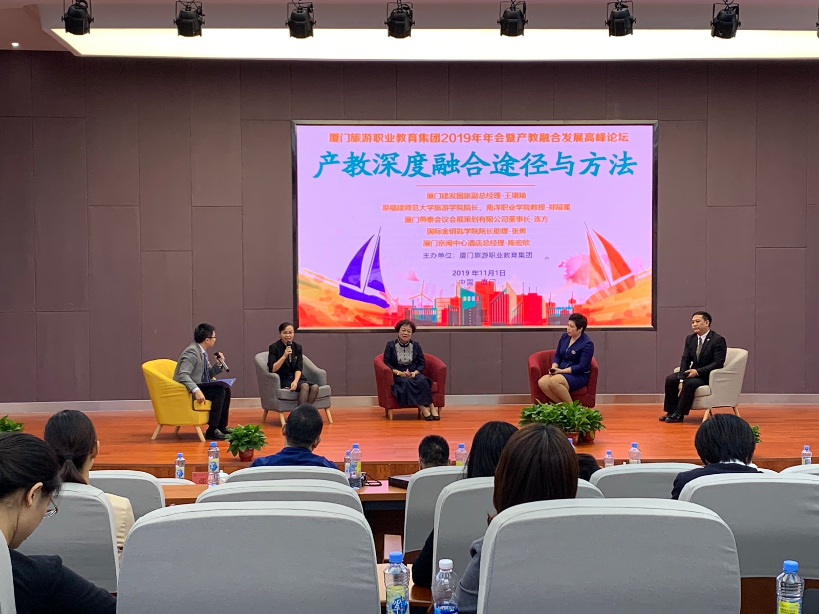 会上,郑向敏教授作题为“新时代旅游教育思维”的主题演讲。他基于新时代社会发展的大趋势,分析了新旅游时代表征——新6时代,即大数据时代、新技术时代、新休闲时代、新交通时代、新媒体时代与新游客时代,并强调旅游教育要靠新时代的思维,如专业发展“+时代”思维、知识传授的“屌丝”思维、人才培养“观念”思维。只有更新教学手段,在时代变革中寻求旅游业新的突破,探索其他行业部门与旅游业的切合点,才能跟上大数据信息竞争对旅游教育的新需求。演讲内容详实丰富,理论深入浅出,说服力强,启迪了全体听众的思维。在圆桌论坛环节,郑耀星教授、王珺瑜总经理、连芳董事长、张勇助理、陈宏欣总经理围绕“产教深度融合途径与方法”主题,就如何深化产教融合、提升校企合作战略、进一步提高厦门特色产业和高校联合的紧密程度、促进人才培养供给侧和产业需求侧结构要素全方位融合等多个方面展开了热烈探讨。