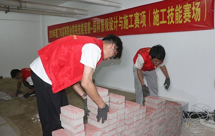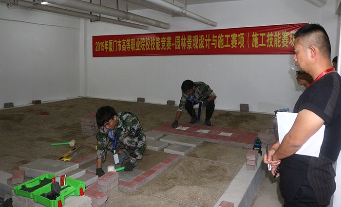 “园林景观设计与施工”赛项则为团体赛,整个赛项时间为 9 小时,共有4所院校的32名选手参与角逐,其中我校环境艺术设计专业的8名同学分别在钟丹、黄少雄、林铭锋三位老师的指导下参赛。本赛项分为“园林景观设计”与“现场施工”两个阶段,第一阶段由设计组2名选手在电脑上绘制景观设计图纸,第二阶段由施工组2名选手依照设计图纸进行实地的现场施工。比赛总分共200分,其中景观设计100分、工程施工100分,要求4名参赛选手在规定的时间里设计、施工5m×6m的小花园,按照提供的材料和设计指标要求绘制场地设计鸟瞰图和完整的施工图一套,并将设计方案按图施工落实到施工竞赛工位。据悉,我校今年投资十万元新建园林景观施工现场,为参赛选手提供更专业细致的参赛体验。
