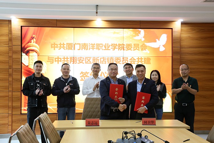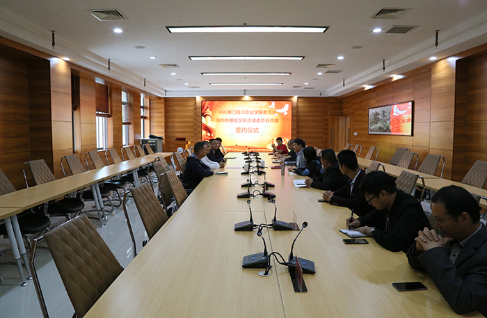 南洋社讯 为深入贯彻落实中央和省市委关于加强城乡基层党组织建设的决策部署和创新开展高校人才培养形式途径,促进校镇党委开展结对共建发展,今日(12月2日)上午,中共厦门南洋职业学院委员会与中共翔安区新店镇委员会共建签约仪式在南洋学院第一会议室举行。南洋学院党委书记施水成,新店镇党委书记张清海一行出席仪式;南洋学院党委委员、各党总支负责人参加仪式。
