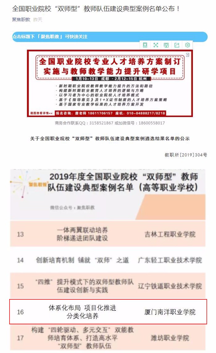 南洋社讯 近日,教育部职业技术教育中心研究所公布了全国职业院校“双师型”教师队伍建设典型案例遴选结果名单,福建省仅有5所高职院校入选,厦门南洋学院榜上有名。
