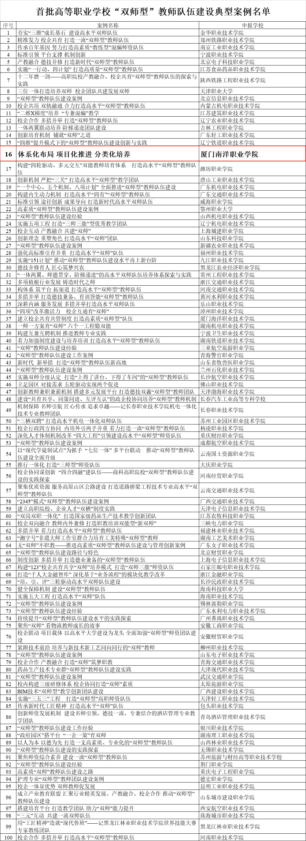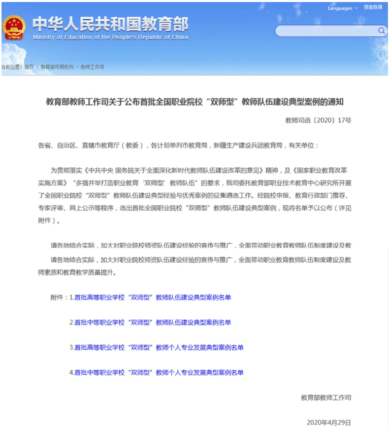 为贯彻落实《中共中央国务院关于全面深化新时代教师队伍建设改革的意见》精神,及《国家职业教育改革实施方案》“多措并举打造职业教育‘双师型’教师队伍”的要求,教育部教师工作司在全国范围内开展了全国职业院校“双师型”教师队伍建设典型经验与优秀案例的征集遴选工作。经院校申报、教育行政部门推荐、专家评审、网上公示等程序,选出首批全国职业院校“双师型”教师队伍建设典型案例100个。
