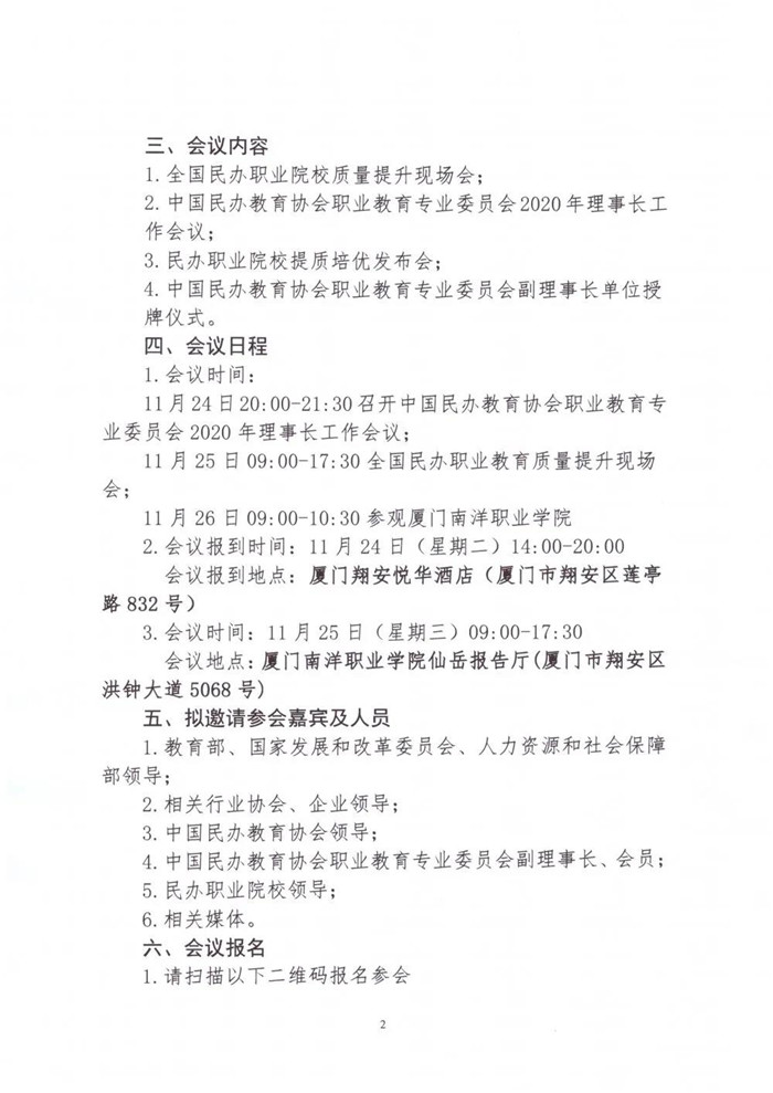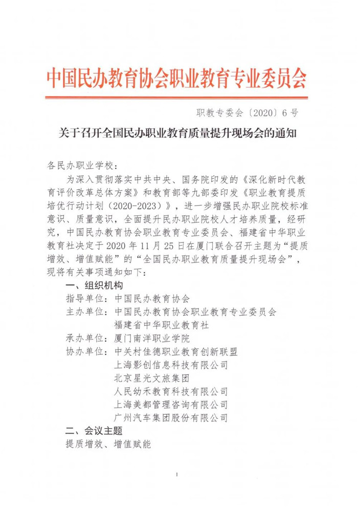 我校将于2020年11月25日承办主题为“提质增效、增值赋能”的“全国民办职业教育质量提升现场会”。此次大会将深入贯彻落实中共中央、国务院印发的《深化新时代教育评价改革总体方案》和教育部等九部委印发《职业教育提质培优行动计划(2020-2023)》,就进一步增强民办职业院校标准意识、质量意识,全面提升民办职业院校人才培养质量,总结交流各地各校加快发展现代职业教育的经验做法,就推进民办职业教育质量提升作出研究部署。