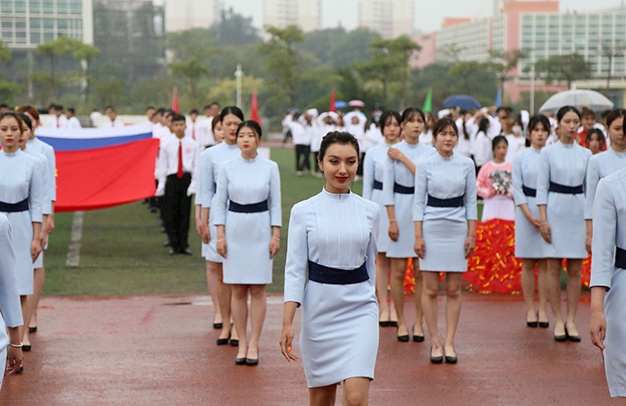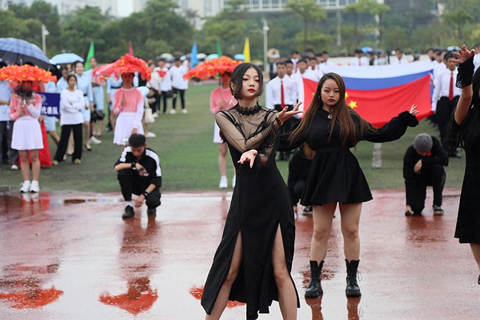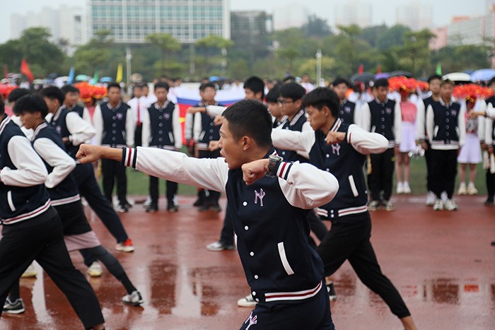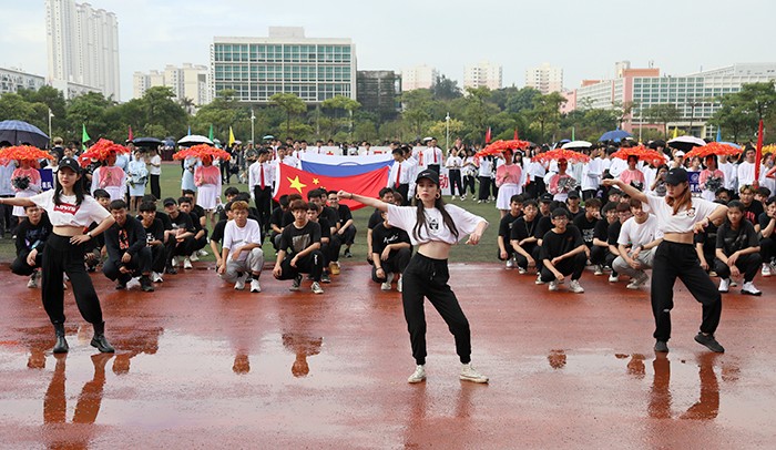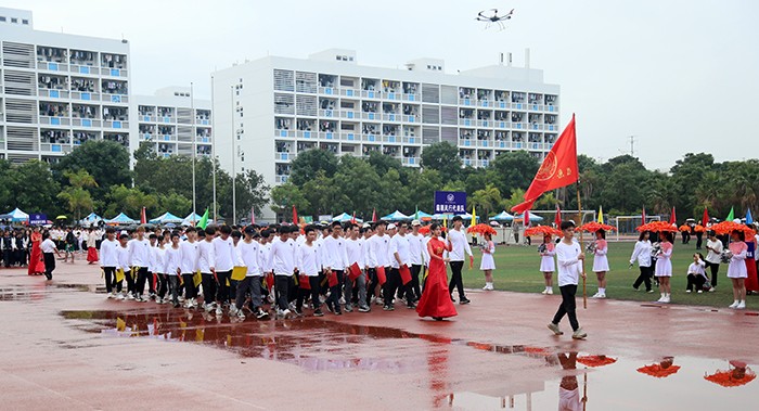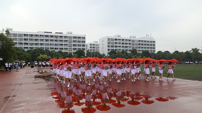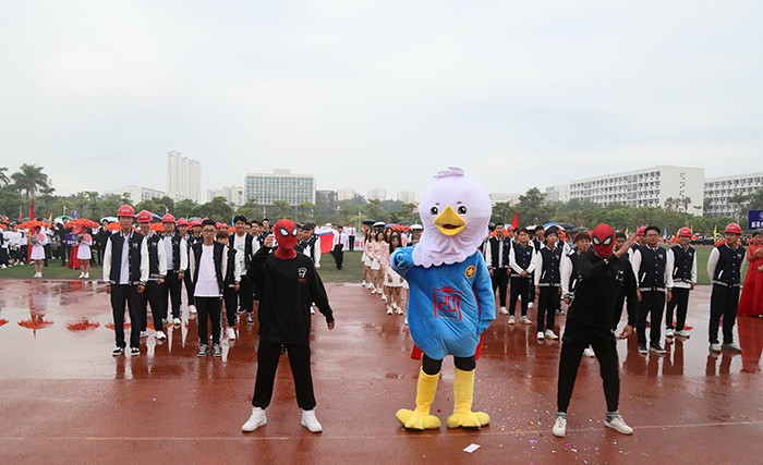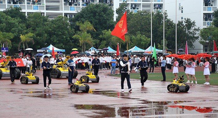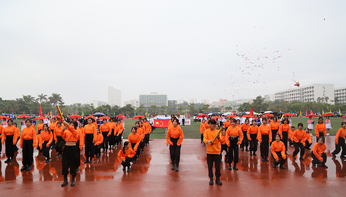 运动会在激昂的运动员进行曲中拉开帷幕。国旗护卫队、校旗队、校徽队、彩旗队、花束队等依次入场。23个由各学院学生、裁判、教师组成的方阵,队列步伐整齐有力,口号坚定嘹亮,给现场观众呈现了精心设计和编排的开幕式表演。无人机、消防机器人等高科技元素轮番亮相,玩偶舞、民族舞、现代舞、制服秀、幼儿操、甩花剑等各种时尚和创意元素应接不暇。他们服装炫丽,编排各有特色,动作整齐划一,既展示了南洋学子奋发向上的精神风貌,更展示了团队合作精神,书写了新时代青年大学生的爱国、爱校情怀。