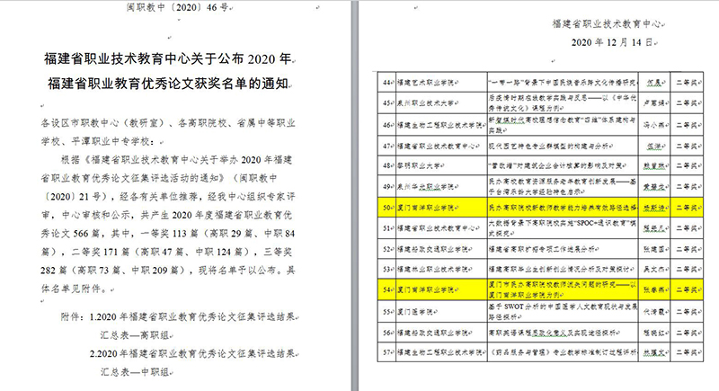 近日,《福建省职业技术教育中心关于公布2020年福建省职业教育优秀论文获奖名单的通知》(闽职教中〔2020〕46号),我校有4篇论文获奖,其中,二等奖2篇,三等奖2篇,这是我校长期以来积极推进职业教育领域研究取得的较好成果。