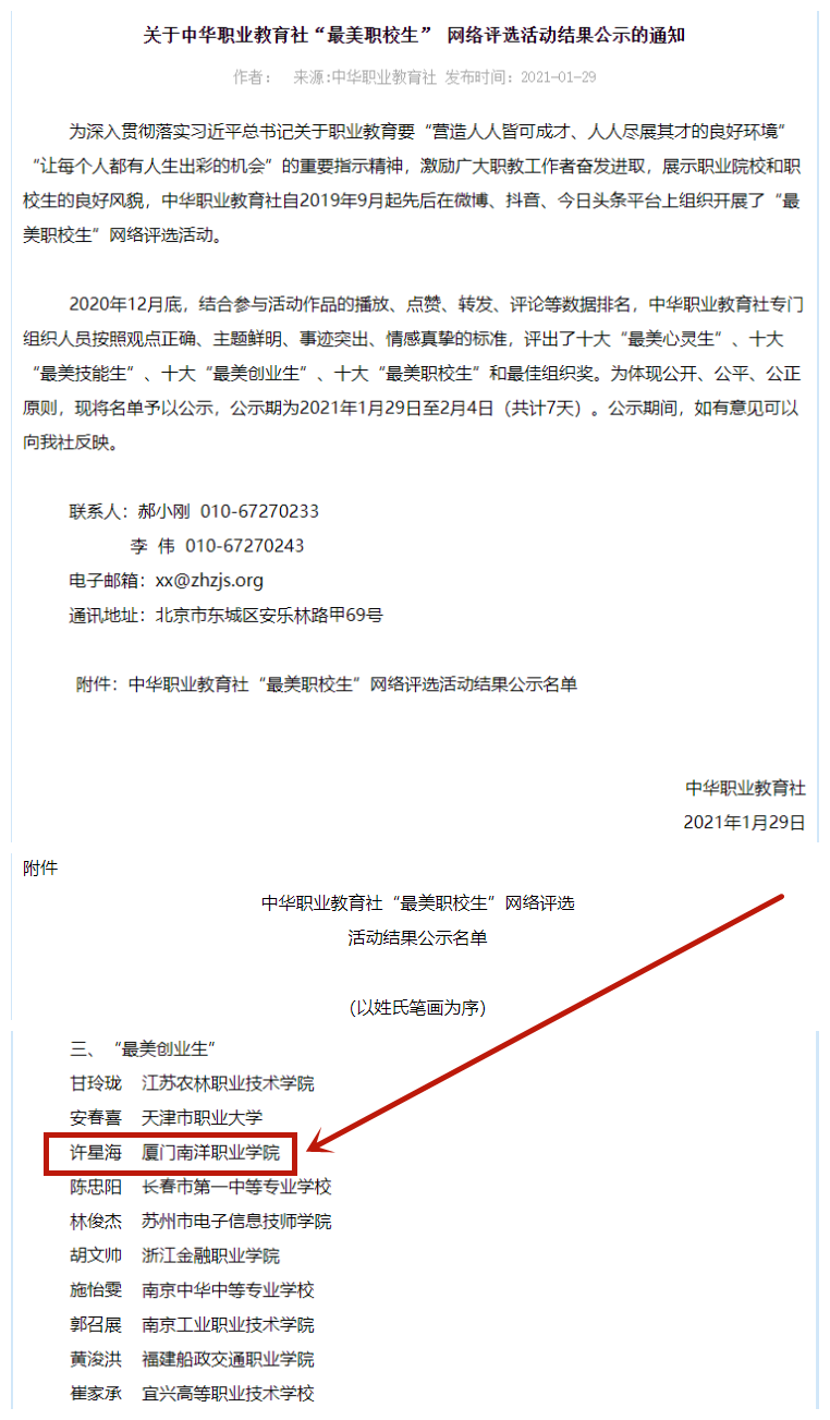 1月29日,中华职业教育社公布的“最美职校生” 网络评选活动结果中,我校学子许星海获“最美创业生”。