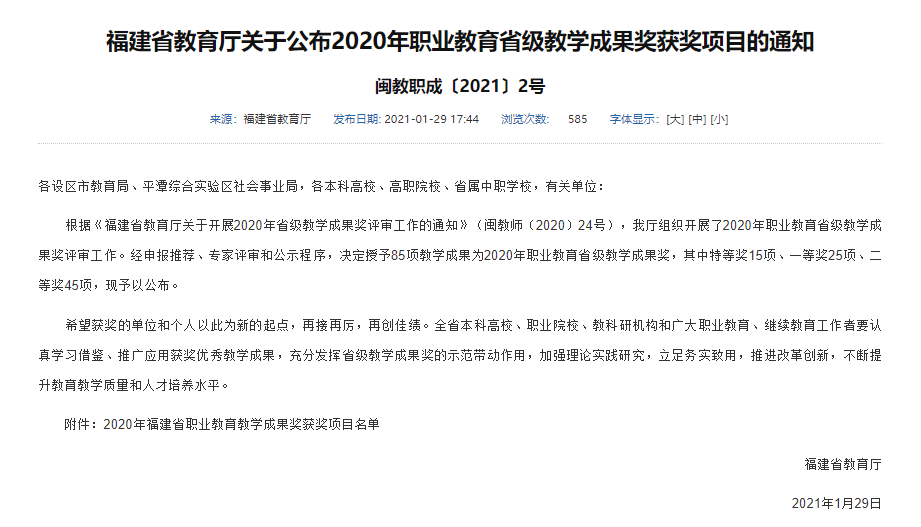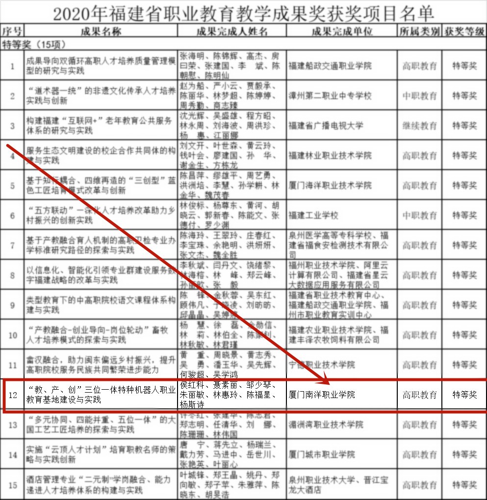 1月29日,福建省职业教育教学成果奖评选结果公布我校《“教、产、创”三位一体特种机器人职业教育基地建设与实践》获特等奖。