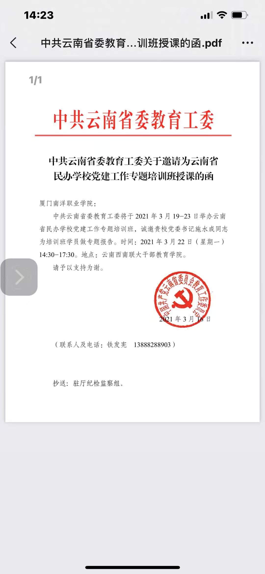 3月22日,由中共云南省委组织部、省委教育工委举办的民办学校党建工作专题培训班在云南师范大学举行,我校党委书记施水成作为国家教育行政学院特邀高校党建培训专家为培训班成员授课,并获得高度肯定。