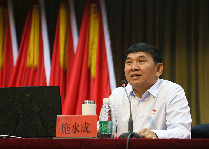 施水成书记围绕习近平总书记在党史学习教育动员大会上的讲话精神,从学党史、悟思想、办实事、开新局四个方面展开,深入分析党史学习教育的重点、我校六大平台的创建、高质量教育体系的建设等,并结合学校工作实际,对进一步做好党史学习教育工作提出新的要求。他强调,要提高站位,深刻领会党史学习教育的重大意义;要严格落实党史学习教育各项工作安排,秉持“学深、悟透、弄通、做实”的实践路径,通过专题民主生活会、组织生活会、党史知识竞赛、红色记忆、庆祝中国共产党成立100周年系列活动等,不断提高政治判断力、政治领悟力、政治执行力,努力做到“学史明理、学史增信、学史崇德、学史力行”。