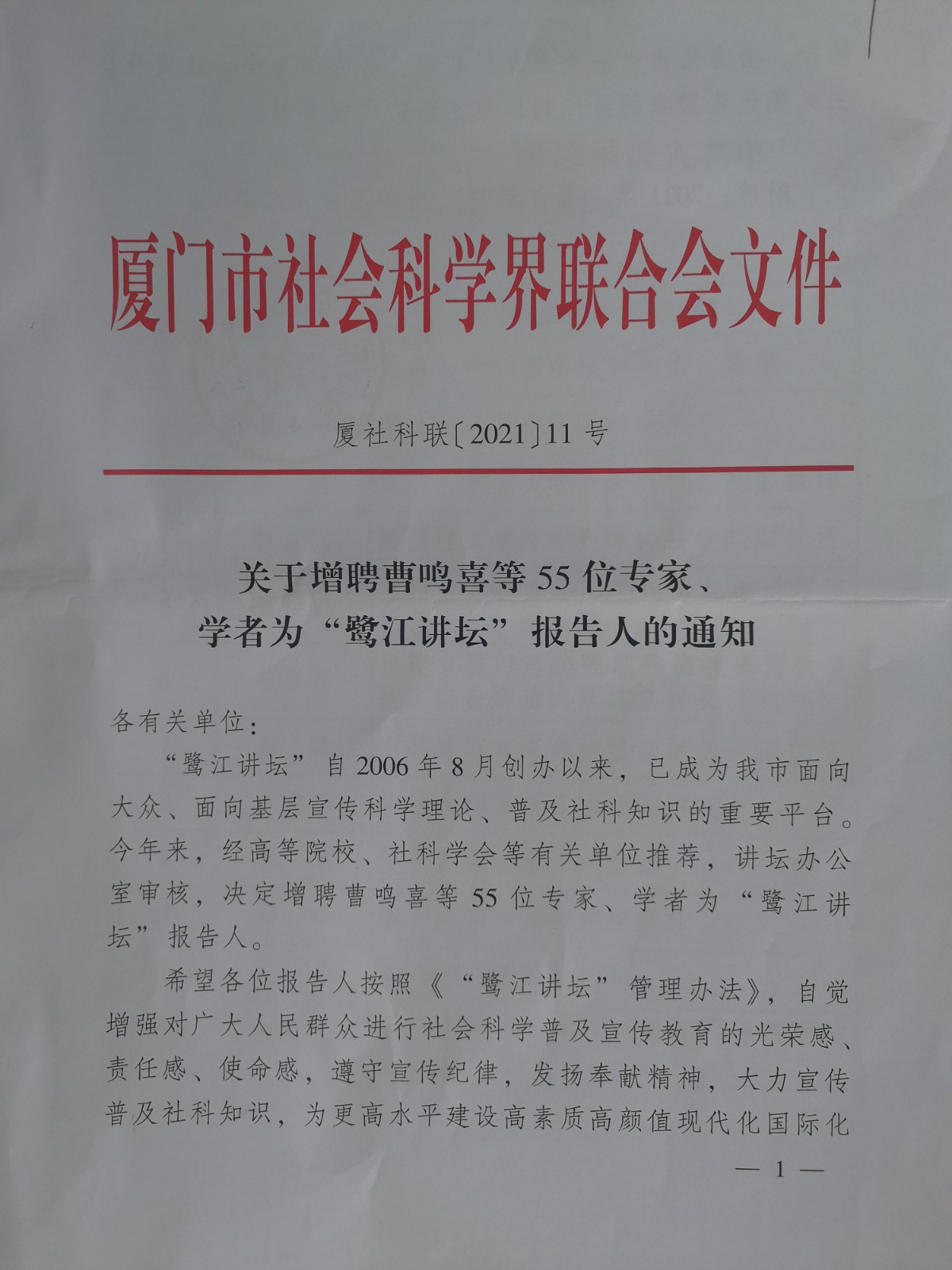 近日,厦门市社会科学界联合会公布“2021年‘鹭江讲坛’增聘报告人名单”,经我校推荐申报的14名候选人全部入选,他们是施水成、康乃美、鲁晓芹、李振杰、蓝德森、崔筱力、侯红科、黄芸、李建清、刘艳艳、毛琛、邹少琴、李娜、许欣欣。