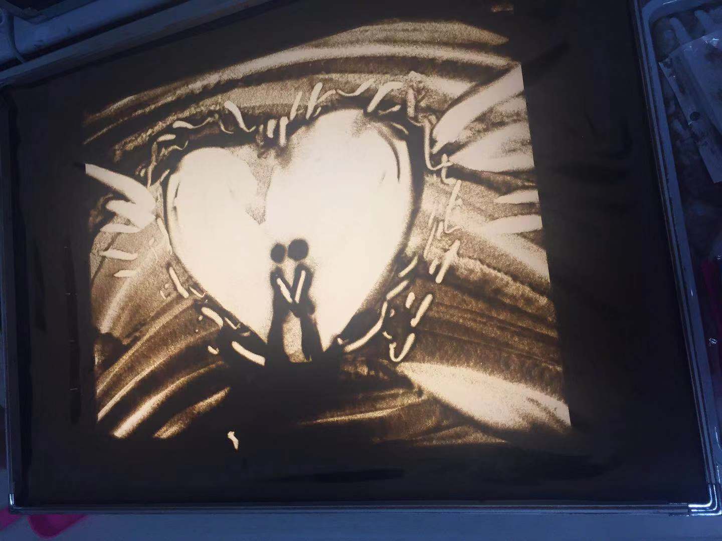 一撒、一摔、一抹、一勾、一挑、一拍,细沙在手指间缓缓流动,王燕君老师创意独特,思维敏捷,聚“沙”成画,描绘了一幅动人的爱情蓝图。她作品表现力极强,语言风趣幽默、通俗易懂,为同学们定格了一个个沙画的精彩与纯粹,进一步拉近了同学们与沙画的距离,引来同学们阵阵欢呼。