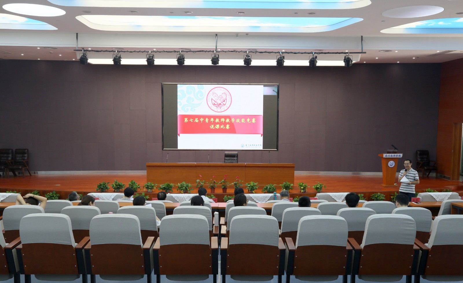 我校第七届中青年教师教学技能竞赛之说课比赛于5月12日、19日分别在仙岳报告厅举行。两场比赛分别由副校长兼教务处处长钟石根、思政部主任兼教务处副处长林峰主持,校领导、教务处、督查室及各二级学院专家共10人担任评委,17位教师参赛。为了让全体教职工更好的参与其中,本次比赛采用了线上直播的方式。