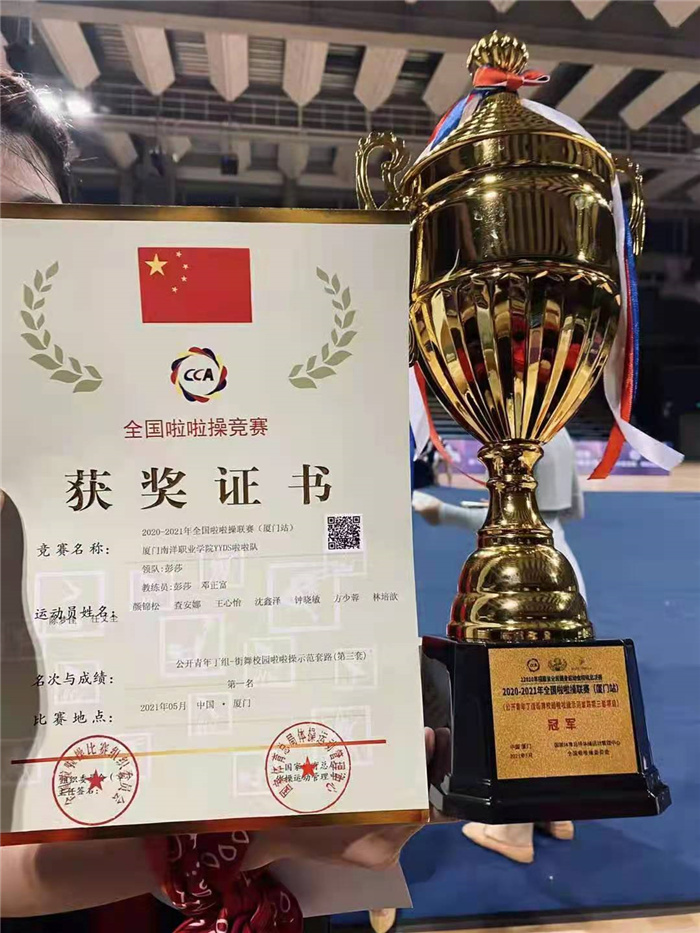 我校YYDS啦啦操代表队分别由20级学前教育2班队长李平和19级计算机专业沈鑫泽队长带领,一群来自不同专业的啦啦操爱好者共同组成集训队参与丁组比赛。在领队林宗岩老师、主教练彭莎老师的指导下,经过3个月的刻苦训练,奋力拼搏,脱颖而出,赛出了水平,赛出了风采,充分展示了南洋人的精神面貌,给兄弟院校和广大群众留下深刻印象,最终斩获公开青年丁组街舞校园啦啦操第一名、丁组爵士啦啦操第一名的优异成绩,彭莎老师获得“优秀教练员”的荣誉称号。
