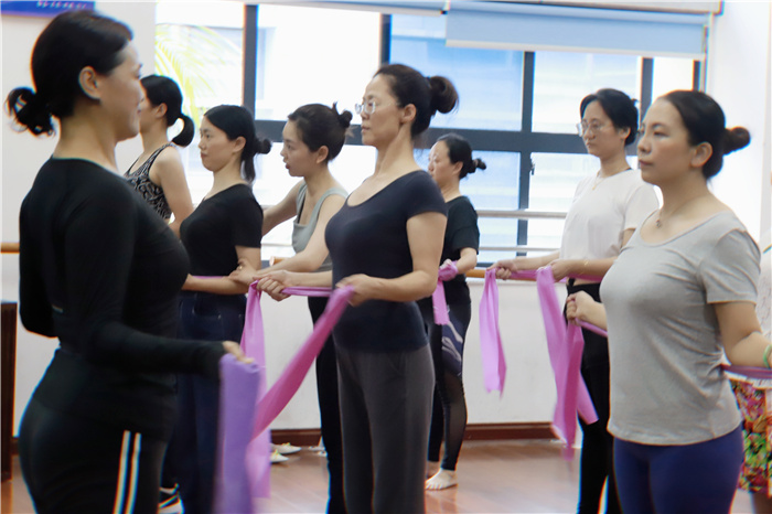 “体态关乎健康和气质,遇见更好的自己从正确体态开始”,杨老师为在场教师分享了形体有关的基本知识和理念,并展示了习练形体后蜕变的真实案例。通过肩背的形体训练,带领大家体验如何改善圆肩驼背等不良体态,如何塑造纤细肩背线条。一个小时的形体训练后,各位参与老师大汗淋漓、意犹未尽,最后以微笑和拥抱表达感谢陪伴练习。