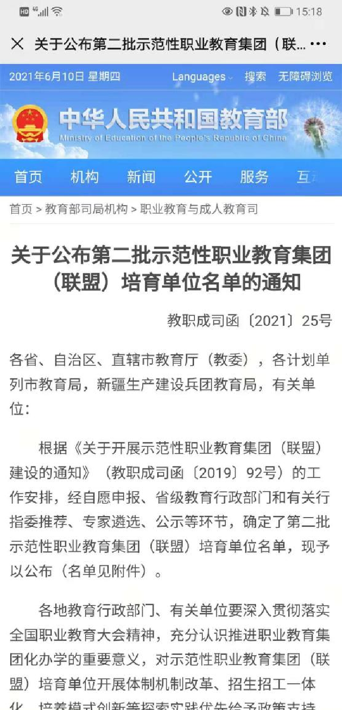 据悉,本次全国共有149家职教集团入选,其中福建省3所。我校继2020年12月28日被福建省教育厅授予“福建省示范性职业教育集团”称号后,此次再次荣获“全国示范性职教集团”称号,充分体现了教育部对我校职教集团历年来工作开展和取得成效的高度肯定和认可,学校将以此次荣誉为起点,再接再励、凝心聚力、创新发展。