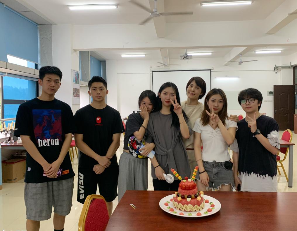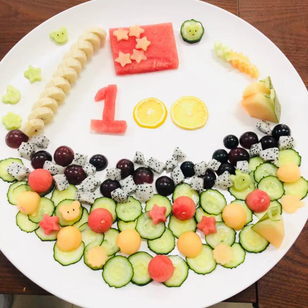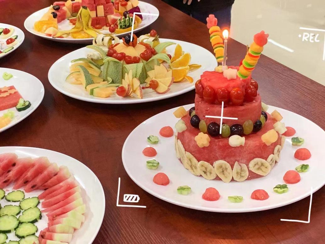 彭宇微、李海珍、陈鑫睿、曾佳豪、林思泉、姜雨嘉六位同学用西瓜创作的“生日快乐”水果蛋糕拼盘,对“七一”的到来献上最诚挚的祝福。
