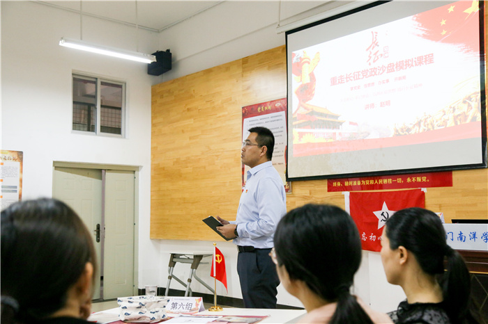 为推动党史学习教育向深处发展,引导全校党务干部牢记革命精神、传承红色记忆,今日(7月8日)上午,我校在学生活动中心307室举行党务干部培训会。厦门大学经济学院特聘讲师、党史沙盘专家赵明受邀来校作“重走长征党政沙盘模拟”课程培训。党委书记施水成出席培训会,全体党务干部参加培训。