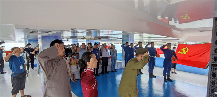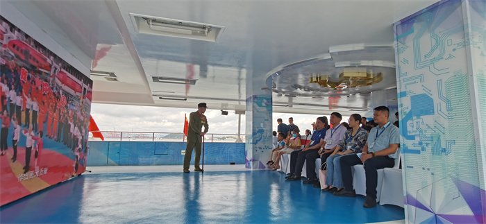 7月12日上午,我校校领导、全体党务干部参观百年主题红船“图强”号,并观看沉浸式海上情景体验项目《碧海红帆》。