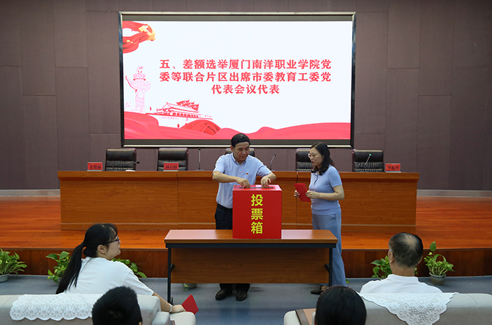 会上,党委书记施水成介绍候选人情况;党委纪检委员鲁晓芹宣读选举办法;党委统战委员钟石根宣读中共厦门市委教育工作委员会《关于厦门南洋职业学院党委、厦门软件职业技术学院党委、厦门安防科技职业学院党委联合选举片区出席市委教育工委党代表会议代表候选人预备人选的批复》。