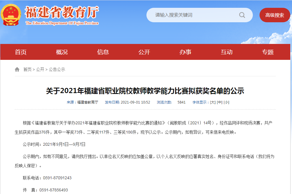 今日(9月1日),福建省教育厅公布《关于2021年福建省职业院校教师教学能力比赛拟获奖名单的公示》,我校代表队在高职组类别中斩获专业课程组2项二等奖。